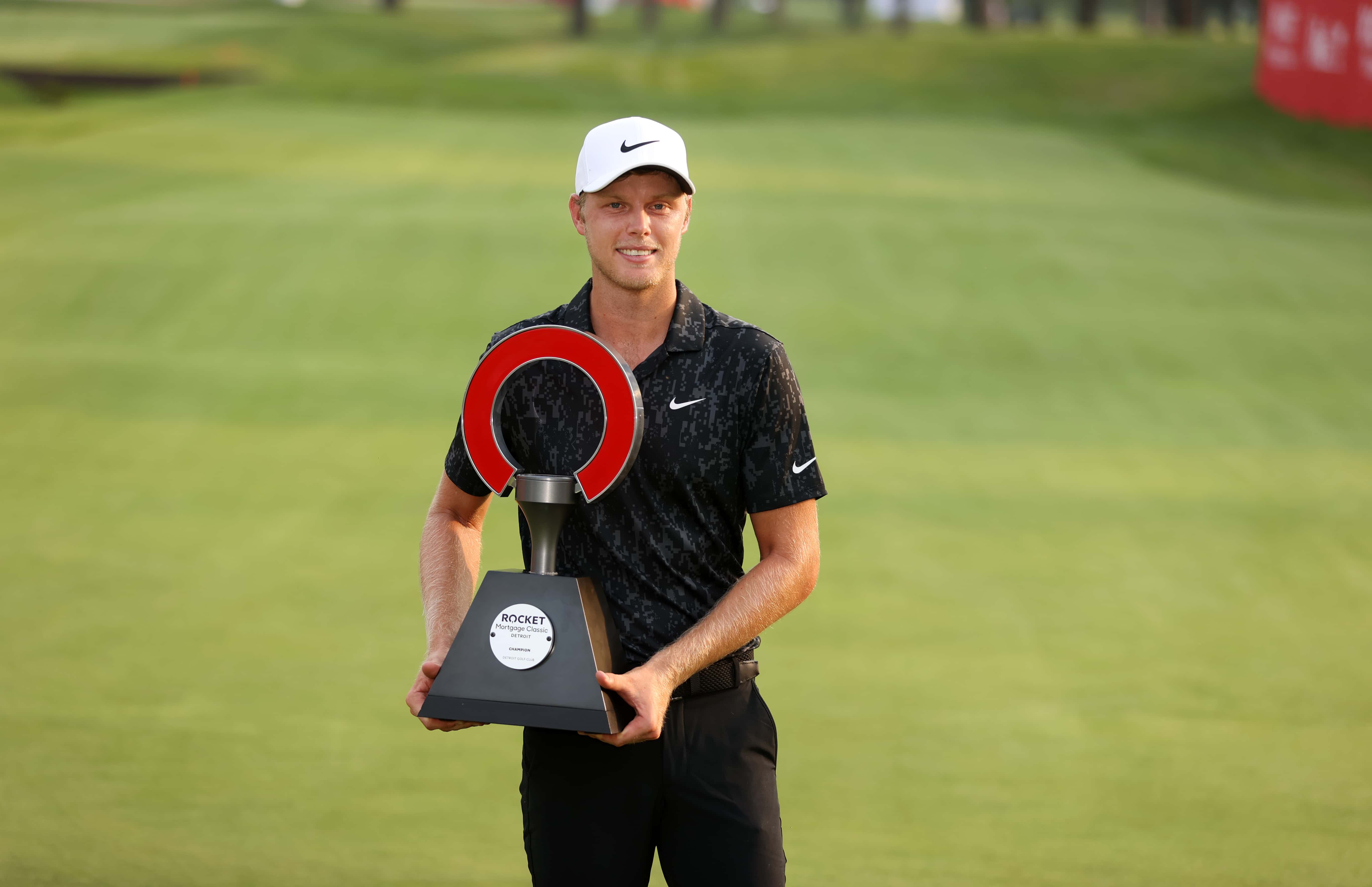 Cam davis holds the winner's trophy after the final round of the rocket mortgage classic on sunday, july 4, 2021, at the detroit golf club in detroit.